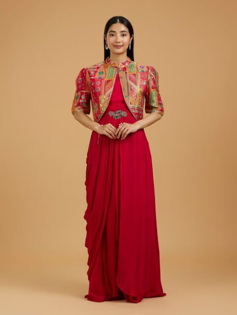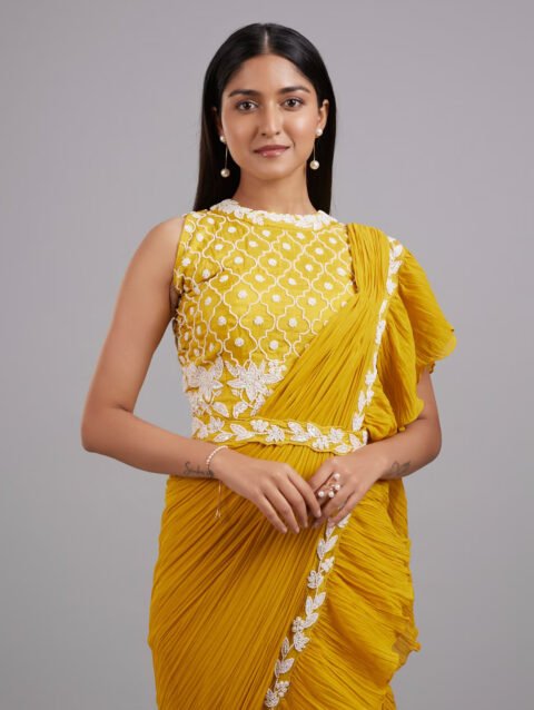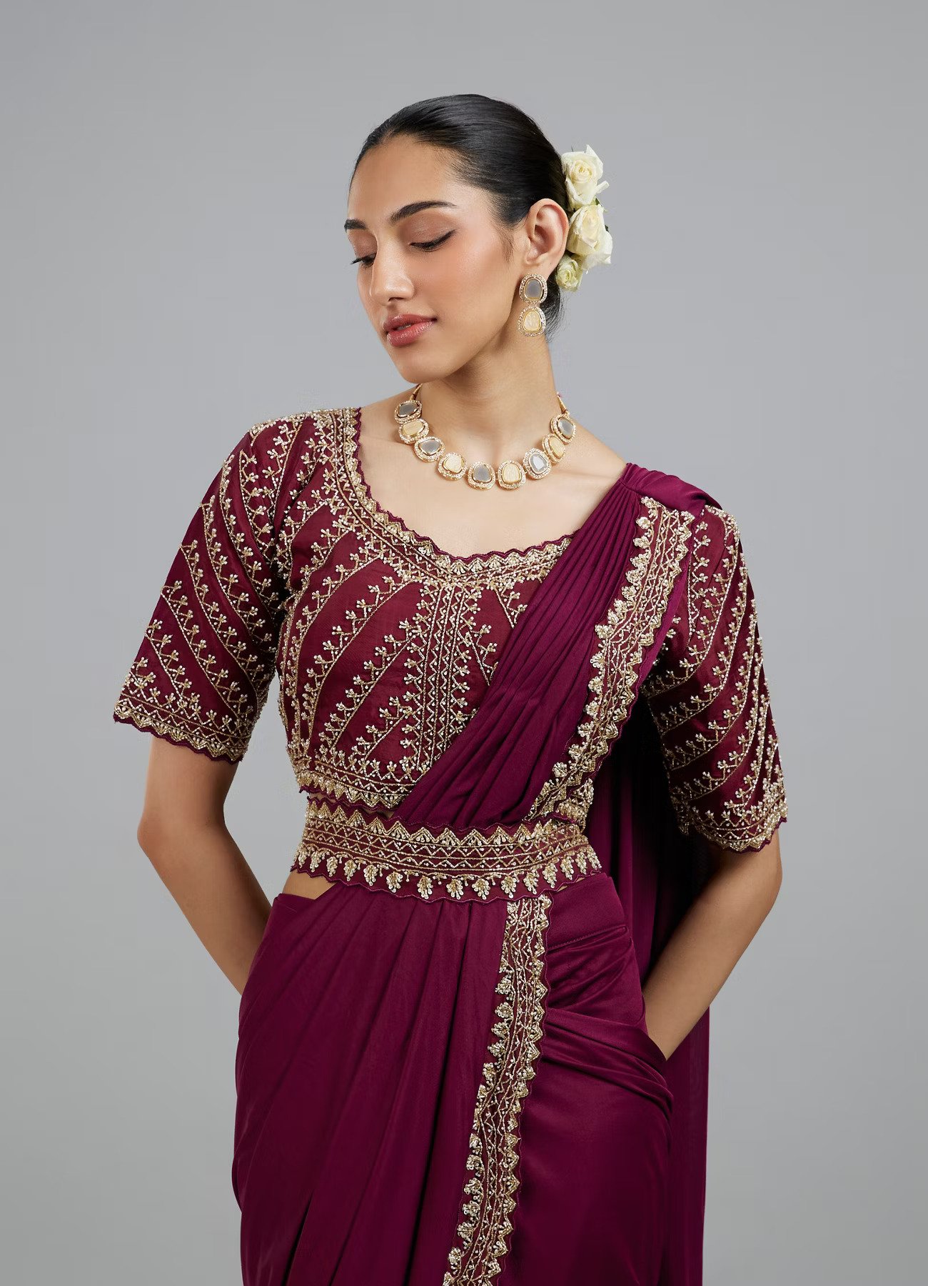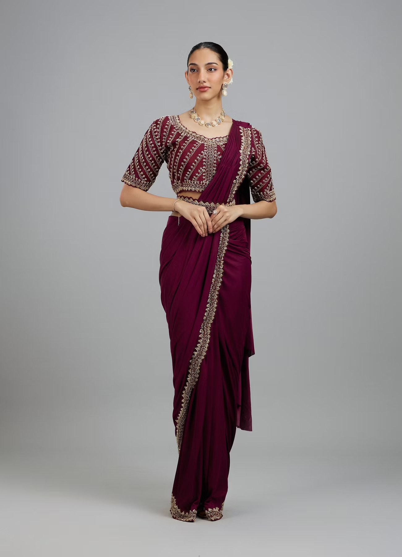Be the first to review “Wine Colored Chinon Pre Draped Saree”