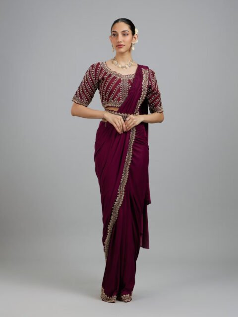 Wine Colored Chinon Pre Draped Saree